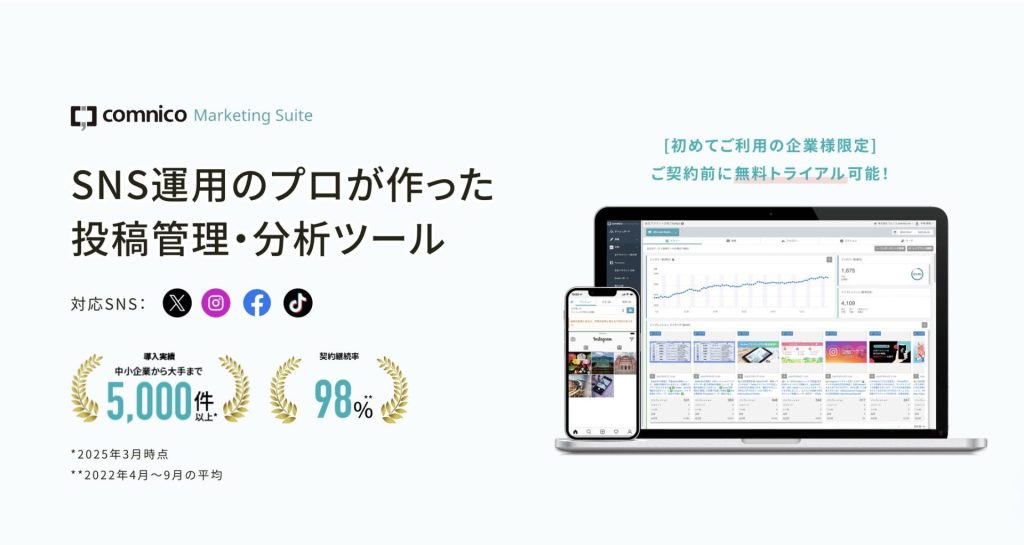X(旧Twitter)、Instagram、Facebookなど、他のSNSの分析も可能です。また、分析だけでなく、予約投稿などの機能も備えています。