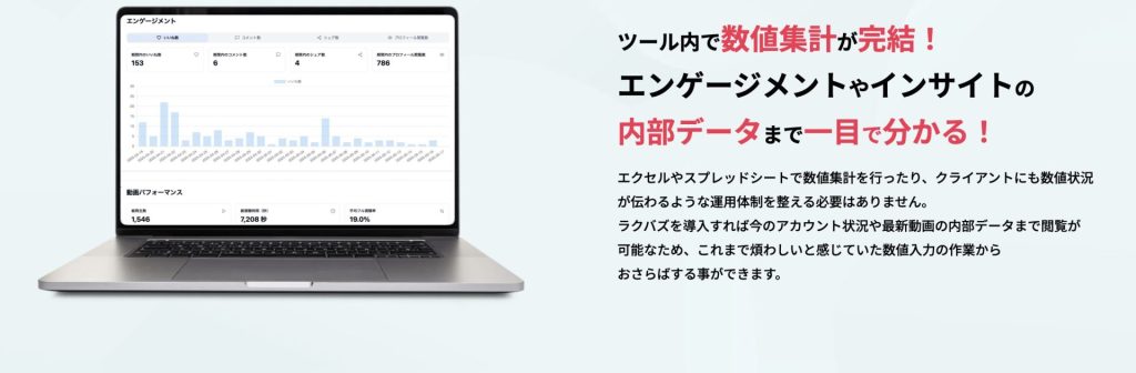 ラクバズはTikTokに特化した国産の分析ツールです。アカウント分析に欠かせないフォロワーや再生数、いいねやコメントなどのエンゲージメントを分析し、改善点を洗い出すことが可能です。