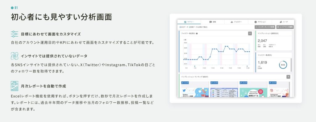 自社アカウントの分析のみならず、他社アカウントも容易に分析できる点が強みです。